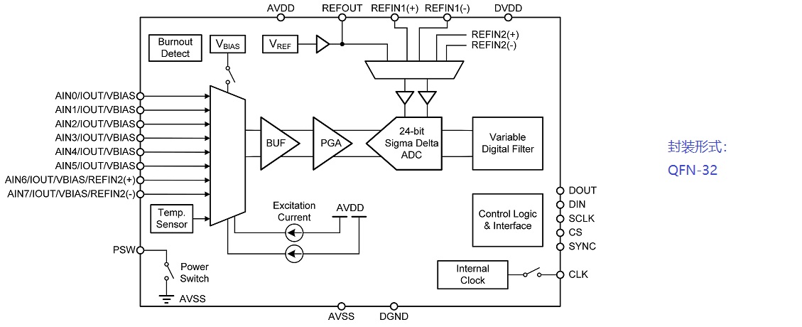 IBSD2722/3/4是适合于高精密测量领域的完整低噪声模拟前端,内置一个低噪声、24位∑-∆模数转换器(ADC)。 片内集成的低噪声可编程増益放大器意味着可直接转换很小的信号。这款ADC有可配置的数字滤波器,对最终输出数据的噪声进行优化,并且能够在嘈杂的工业环境中提供50Hz 和60Hz噪声抑制。可编程增益放大器(PGA)具备低噪声特性,并且可提供1到128的增益。芯片提供了极高的信号链集成度,集成低漂移带隙基准、可编程低漂移激励电流源、开路测试(burnout)和偏置电压产生器。该芯片还允许用户釆用内部时钟或外部时钟工作。