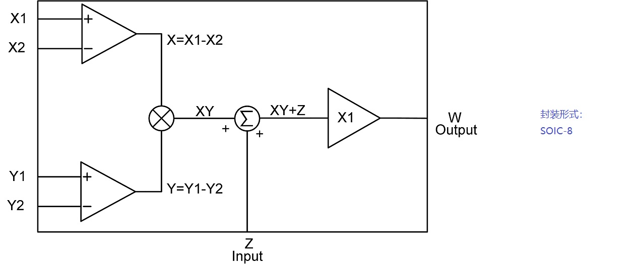 CF835MF 是一款完整四象限电压输出模拟乘法器,它能产生输入电压X和输入电压Y的线性乘积,输出具有200MHz的-3dB 的带宽,在负载150Ω的条件下,满量程1%建立时间典型值为50ns,具有低至50nV/sqrt(Hz)的超低噪声,在同类产品中具备很强的竞争力。IBSA1111 差分乘法输入X、Y以及加法输入Z均为高阻抗,输出W为低阻抗,可以驱动低至25Ω的负载。采用SOIC-8 陶瓷封装,满足在-40℃~125℃的汽车级应用需求。