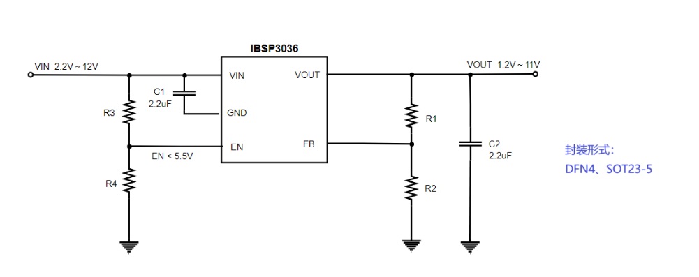 IBSP3036是一款低噪声、高PSRR、快速瞬态响应和低压差线性稳压器。提供200mA输出电流时压差仅为230mV。输入电压范围从2.2V至12V,输出可调电压范围从1.2V至(Vin-Vdrop)V。其静态工作电流典型值为0.3mA,关断模式下小于1μA,非常适用于对噪声敏感和低功耗的场景。实际应用中,IBSP3036输出端仅需一颗2.2μF陶瓷电容即可提供超低的噪声性能和良好的电路稳定性。内置多种保护电路,包括过流、过热限制等。IBSP3036支持1mm*1mm DFN4、SOT23-5封装,工作温度范围-40℃~+125℃。